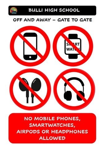 Bulli High School is implementing this policy through an ‘Off and Away - Gate to Gate’ strategy. The policy will apply to mobile phones, airpods, headphones and smartwatches during all school hours.